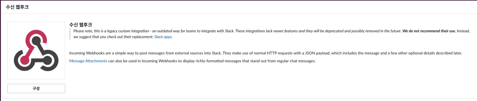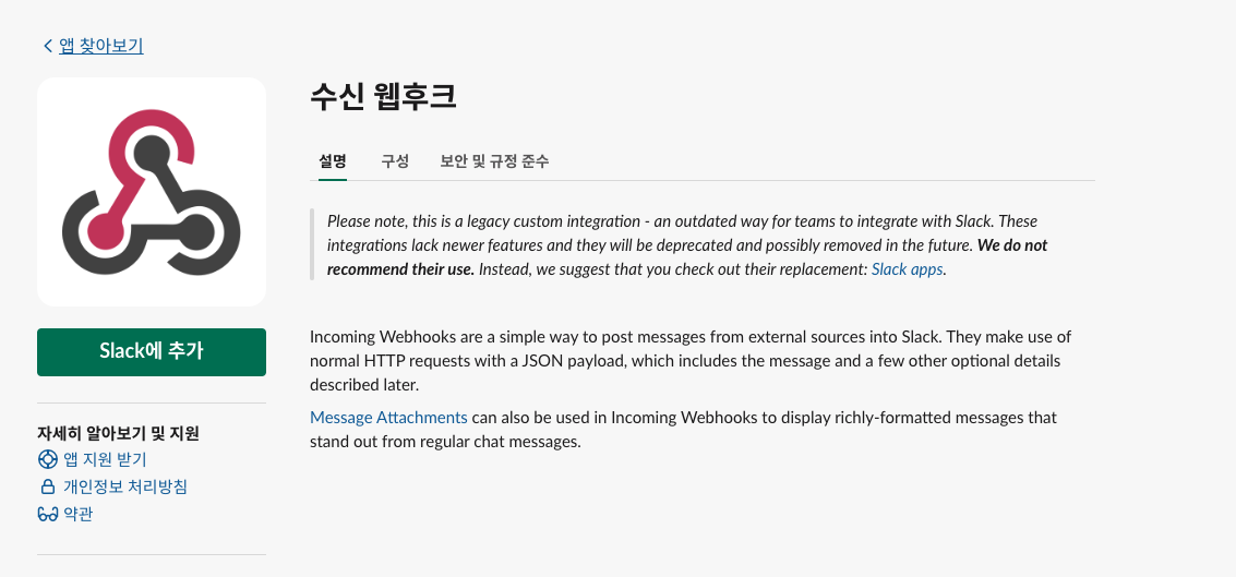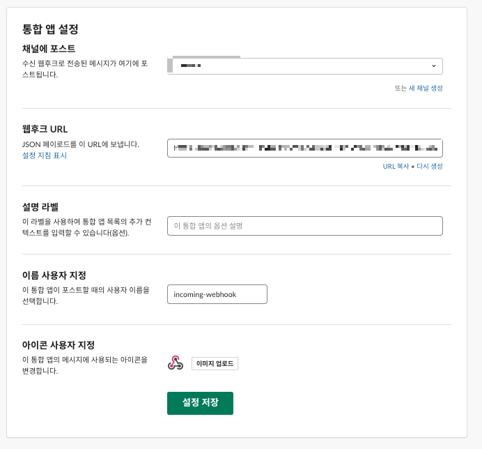 웹후크 URL : 이부분이 정말 중요한데, 슬랙 webhookUrl + token으로 구조가 되어있기 때문에 외부 유출에 유의!
