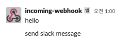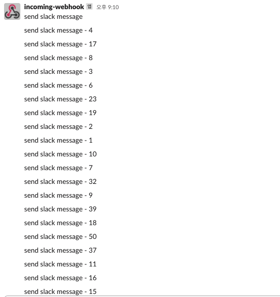 @RestController class SlackResource( private val slackService: SlackService, ) { @GetMapping("/api/v1/slack") suspend fun sendMessage() = slackService.sendMessage() @GetMapping("/api/v1/slack-bulk") suspend fun sendBulkMessages() = slackService.sendBulkMessages() } @Service class SlackService( private val slackClient: SlackClient, private val slackProperties: SlackProperties, ) { suspend fun sendMessage(): String { val webhookModel = slackProperties.getWebhookModel("test1") val slackMessageModel = SlackMessageModel("send slack message") return slackClient.send(webhookModel, slackMessageModel) } suspend fun sendBulkMessages() { val webhookModel = slackProperties.getWebhookModel("test2") val slackMessageModels = (0..50).map { count -> SlackMessageModel("send slack message - $count") } slackClient.sendBulk(webhookModel, slackMessageModels) } }Slack Test-단건