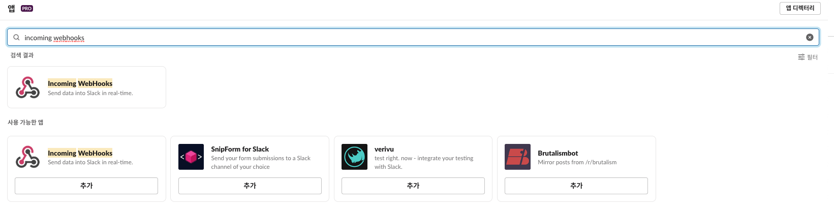 Slack App을 연다음에 앱 추가에서 Incoming WebHooks를 선택